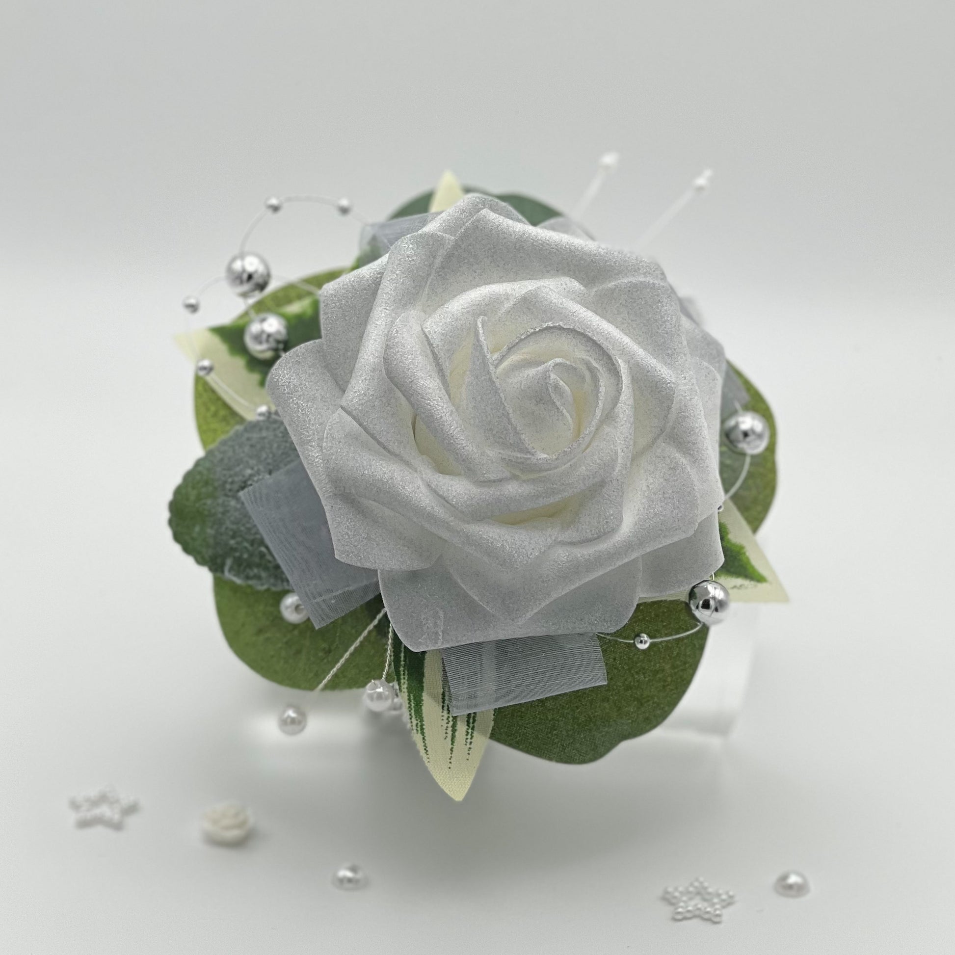 A pretty keepsake debs flower corsage made with an artificial light silver rose and attached to a silver pearl bracelet.